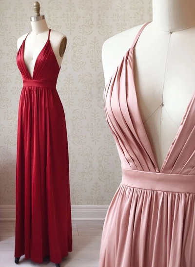 Simple A Line Deep V Neck Red/Pink Long Prom/Evening Dresses with Ruffles,SB2297
