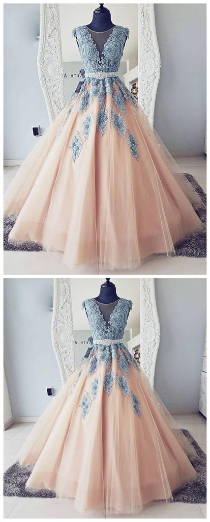 SBR001, Charming A-line Long Prom Dresses Cap Sleeveless Lace Tulle Appliques Evening Dresses