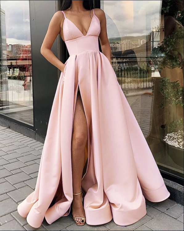 SBR005,V-neck Satin Long Prom Dresses Spaghetti Straps Evening Dresses