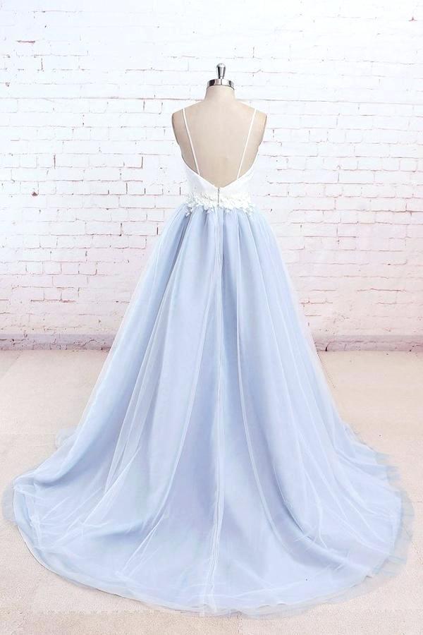SBR085,Sweetheart Neck Backless Blue and White Sweep Train Lace Prom Dress,Formal Dress