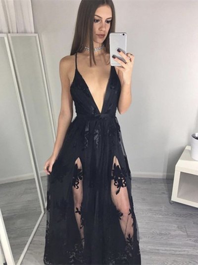 SBR111,A Line V Neck Black Lace Prom Dresses, V Neck Lace Formal Dresses