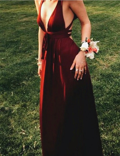 A Line Deep V Neck Backless Maroon Prom Dress, Maroon Backless Formal Dress, Backless Evening Dress,SB2256