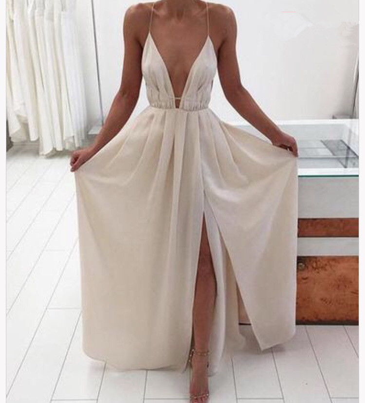 A Line V Neck Backless White Prom Dress,White Formal Dress,Evening Dress,SB2316