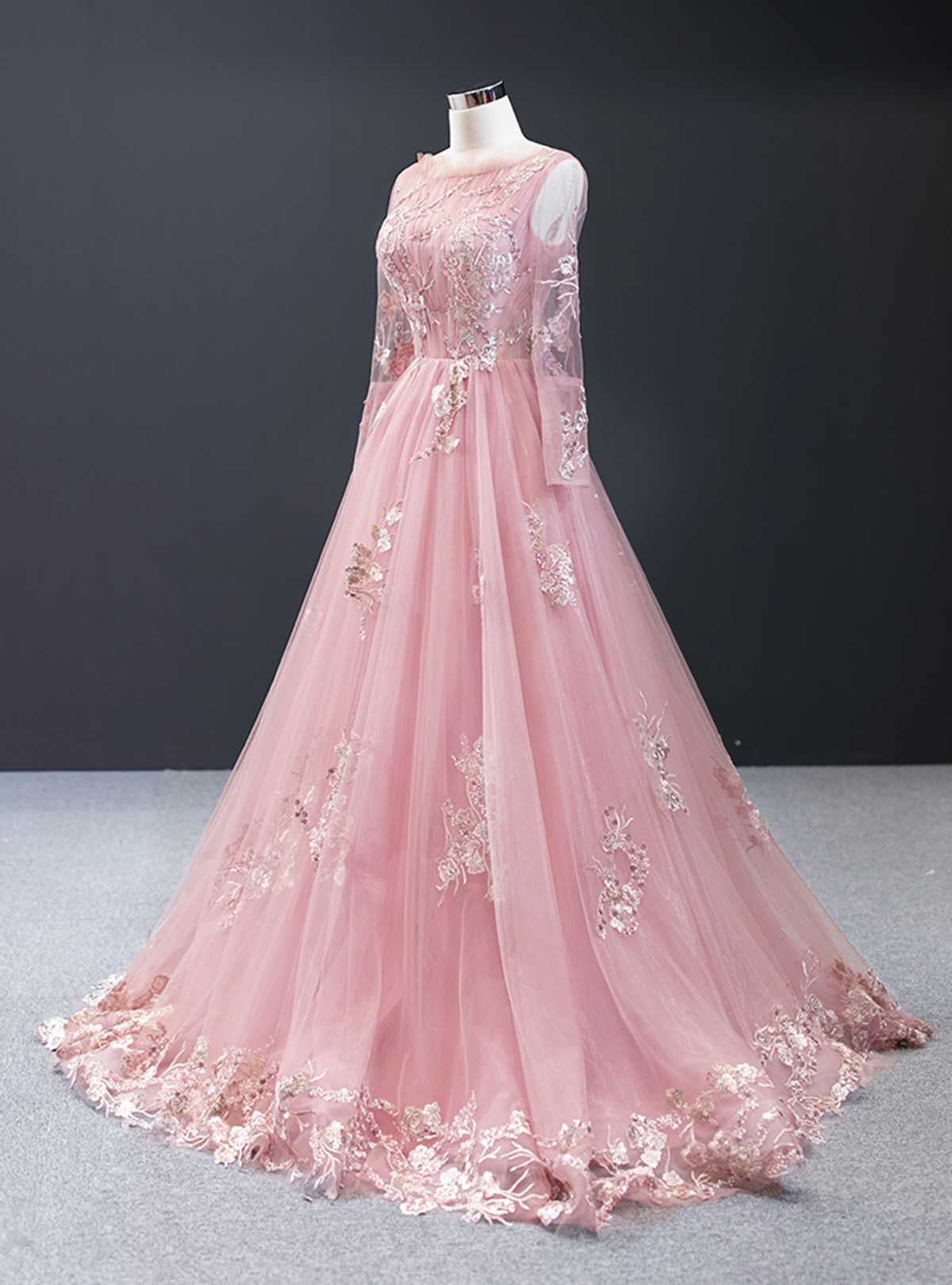 Pink Tulle Long Sleeve A Line Customize Lace Formal Prom Dress, Evening Dress,SB2243