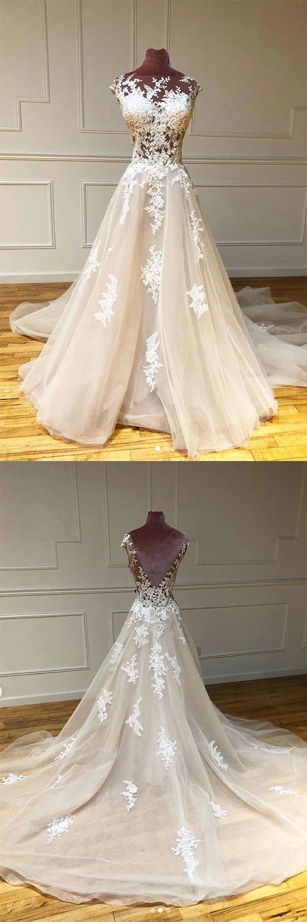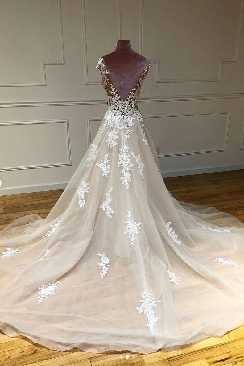 Creamy Tulle Open Back Long Cap Sleeve Tulle Prom Dress, Evening Dress,SB2247