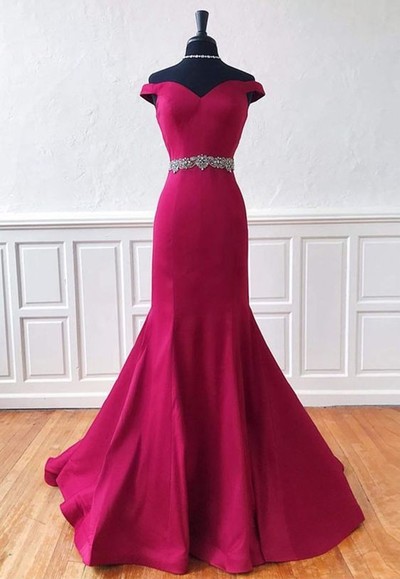 Burgundy Satin Off Shoulder Sequins Waistline Long Mermaid Prom Dress, Evening Dress,SB2267