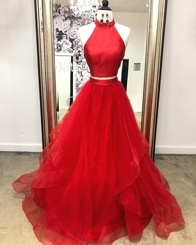 Red Tulle O Neck Two Pieces Long Strapless Prom Dress, Homecoming Dress,SB2265