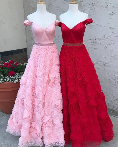 Pink Satin 3D Flora Long Off Shoulder Prom Dresses Beaded Red Satin Evening Party Gowns, Formal Pageant Dress,SB2285