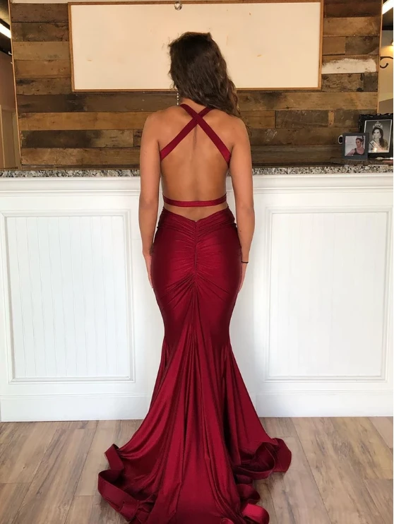 Sexy Mermaid Deep V Neck Burgundy Long Prom/Evening Dress Backless,SB2280