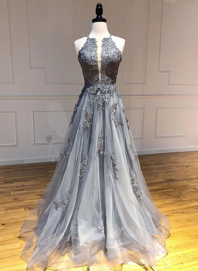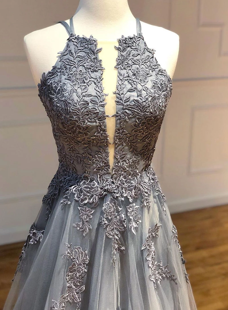 Charming A Line Halter Dark Gray Long Prom Dress Appliques,SB2321