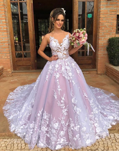 Gorgeous A Line V Neck Pink Long Prom/Wedding Dresses with Appliques,SB2324