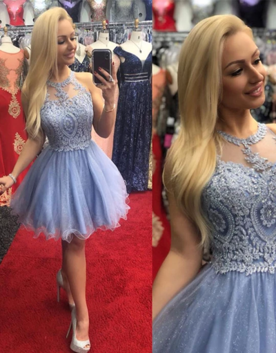 Cute A Line Jewel Blue Short Homecoming Dresses with Appliques,SB2325