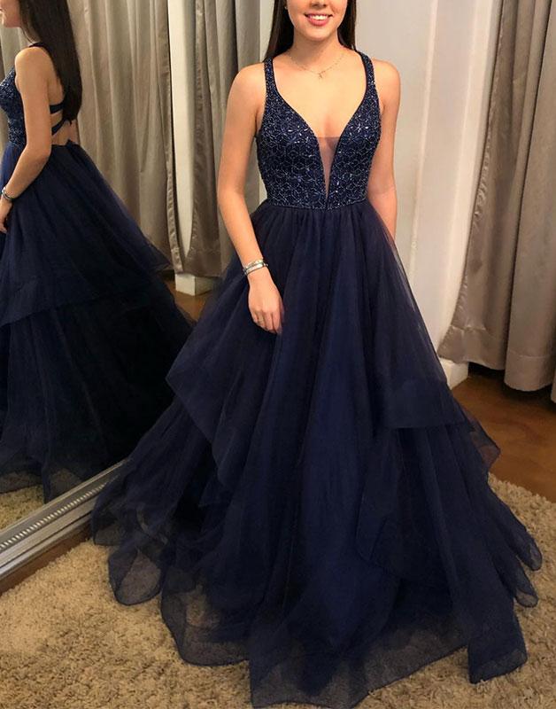 Classic A Line Deep V Neck Navy Blue Long Prom/Evening Dresses with Appliques,SB2341