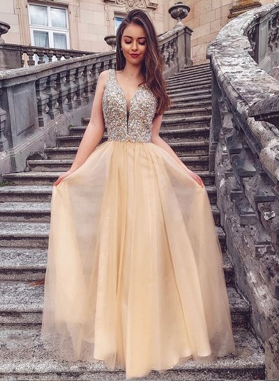 Bling A Line Deep V Neck Champagne Long Prom/Evening Dresses with Beading,SB2349