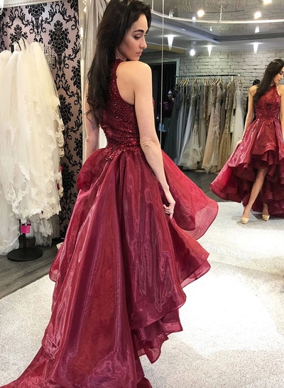 Luxurious A Line Jewel High Low Burgundy Long Prom/Evening Dresses,SB2364
