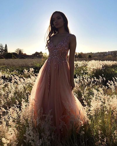 Glamorous A Line V Neck Pink Long Prom/Evening Dresses with Beading,SB2308