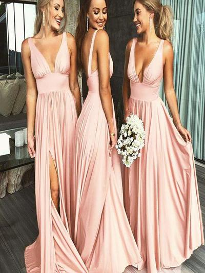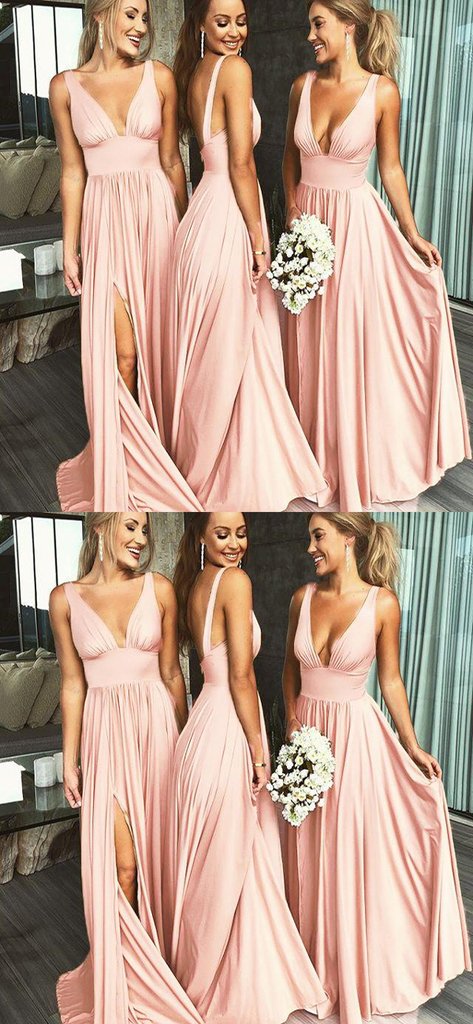 Beautiful A Line V Neck Pink Long Bridesmaid Dresses with Ruffles,SB2314