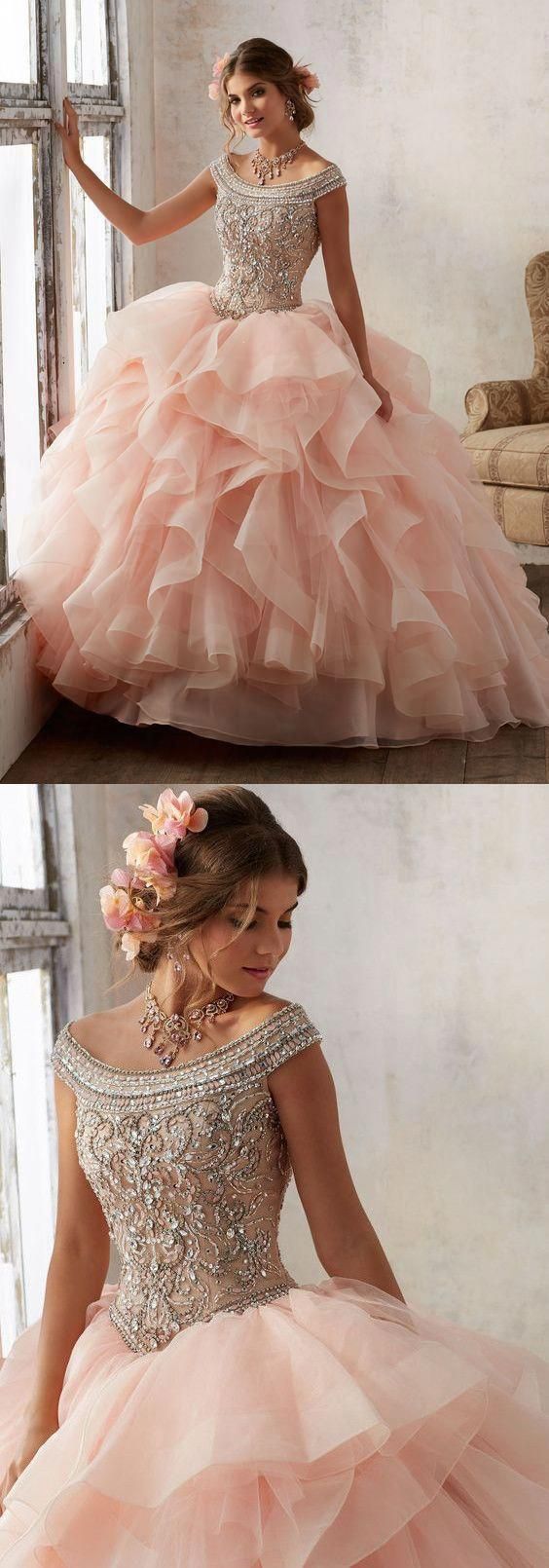 Blush Pink Prom Dresses,Quinceanera Gown Chiffon,Beaded Off the Shoulder Sweet 16 Dress,SB2326