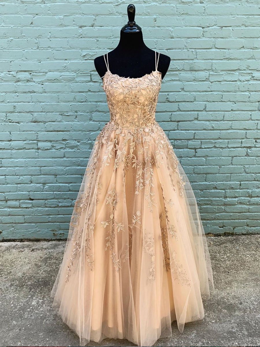 Double Straps Tulle Long Prom Dresses with Appliques,SB2349